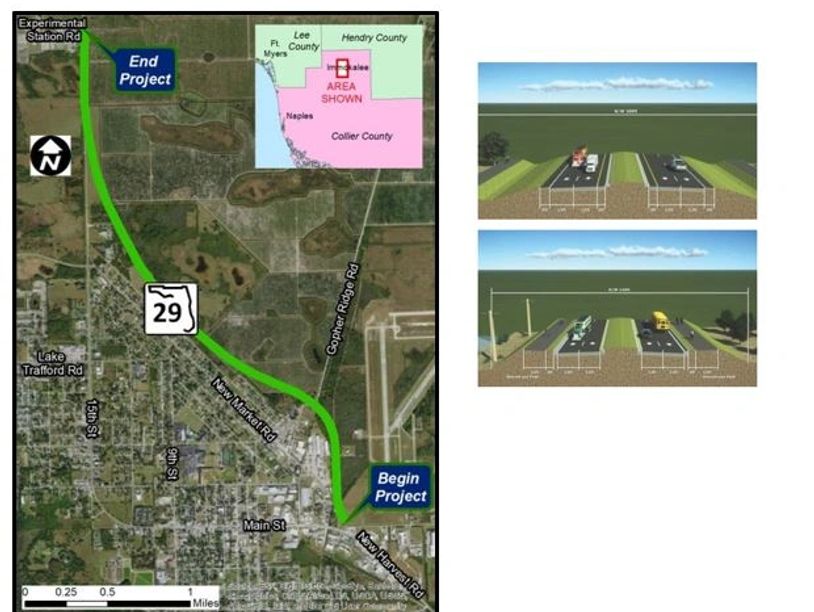 The Loop Road is designed to divert much of the truck traffic from SR29 through downtown Immokalee, particularly along Main Street and New Market Road West, where the western portion of the roadway runs through residential areas. The project will connect to Airport Access Road and Alachua Street, providing direct access from the Loop Road to industrial, grower, packing, and shipping districts along New Market Road. This segment covers 3.35 miles, with the overall SR29 Project divided into five segments.